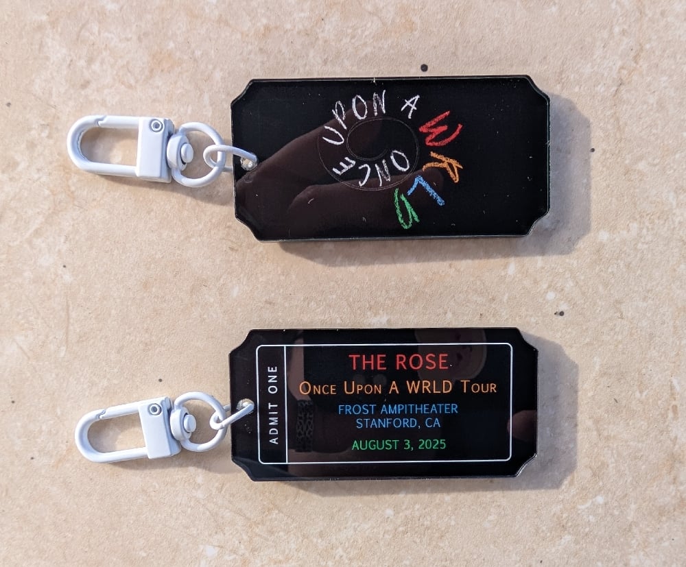 Made with high-quality acrylic, this double-sided keychain features a custom ticket design matching The Rose's tour logo and concert colors. This keychain is the perfect way to commemorate the Once Upon a WRLD Tour!!
